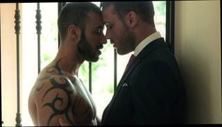 MENATPLAY Men In Suits Damon Heart And Logan Moore Ass Breed: classy men in suits Damon Heart, Logan Moore are making out passionately before dick sucking and rimming, leading to wild anal fucking!