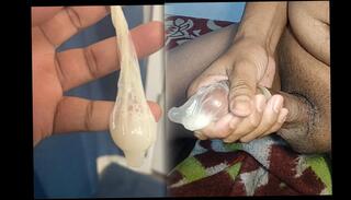 The camera inside the deep pussy records a huge ejaculation with a stuck condom
