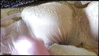 Jerking with Victoria secret bras satin panties with cumshot: stroking with wifes sexy Victoria secret bras and her satin panties to porn video and shot my load on her satin panties