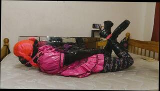 Sissy Maid Strict Armbinder Hogtie: extra strict hogtie this time with ankles attached to a chest tie with rope ratchet.. alot less movement then armbinder to ankles.. luckily I had a large dildo locked in place to keep me company.