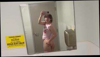 Transboy shows off his cute naked body in a public restroom with the door unlocked